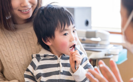 小さなお子さんにとって、お口の中を触られたり歯を削られるのはとっても怖いことです。 当院ではお子さんが歯科医院に慣れるところから診療を始めます。なるべく歯医者に対しての嫌なイメージを植え付けないよう、治療よりもコミュニケーションを優先します。 来院時にできたことを褒め、認めることで、お子さんも達成感を感じ心の成長にもつながります。 予防のためのフッ素塗布やシーラントも行っています。 いつまでもお口の健康を維持できるよう、定期的にご来院ください。